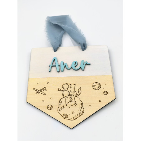 Pequeño banderín infantil de madera bicolor, con letras en relieve.