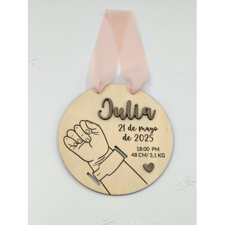 Natalicio en madera bicolor para colocar la pulsera del hospital.