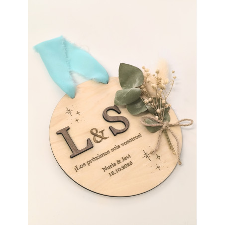 Placa circular, fabricada en madera bicolcor, con ramillete de flores.