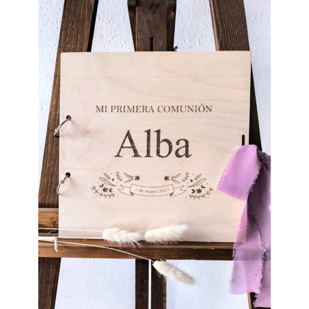 Libro para firmas y fotos con tapas de madera "Mi Primera Comunión".