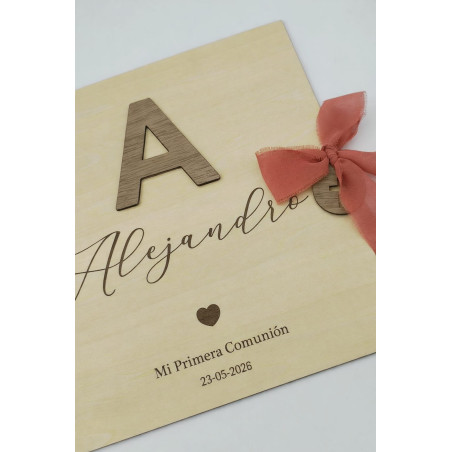 Libro de firmas fabricado en madera bitono, con nombre y fechas grabados, e inicial en relieve. Pequeño detalle en forma de cruz en el lazo, a juego de la inicial.
