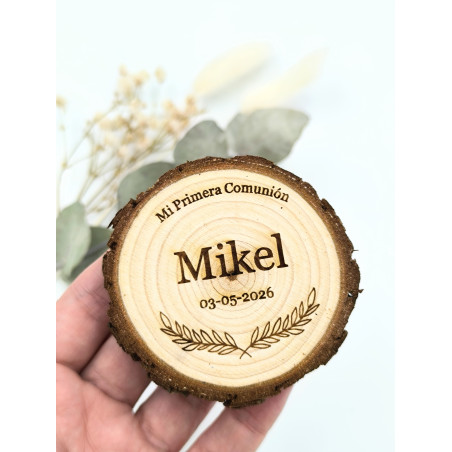 Recordatorio "Mi Primera Comunión" en tronquitos de madera natural con imán.