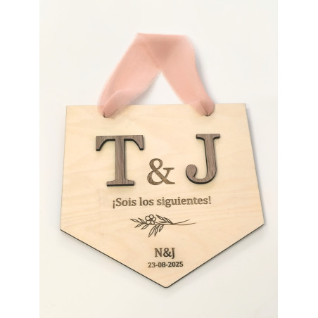 Banderín fabricado en madera bitono grabado a láser con letras en relieve.
