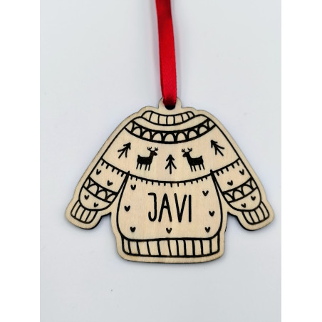 Adorno de madera con forma de jersey navideño.
